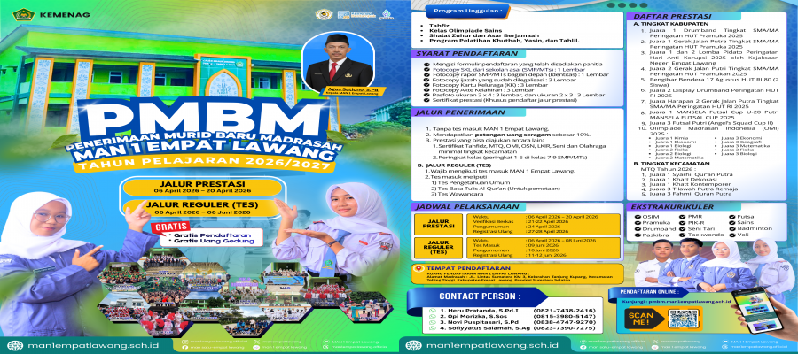 Kesempatan emas bagi lulusan SMP/MTs untuk bergabung dengan salah satu Madrasah Aliyah terbaik di Kabupaten Empat Lawang. MAN 1 Empat Lawang kini membuka pendaftaran